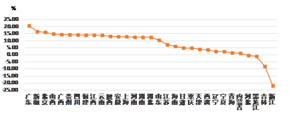 從各地區(qū)建筑業(yè)總產(chǎn)值增長(zhǎng)情況看,有 27 個(gè)地區(qū)的建筑業(yè)總產(chǎn)值較上年同期有不同幅度的增長(zhǎng)。其中,廣東、新疆、北京的增幅均超過(guò) 15%。有 4個(gè)地區(qū)出現(xiàn)負(fù)增長(zhǎng),其中,浙江出現(xiàn)了 超過(guò)20% 的負(fù)增長(zhǎng)(圖 2)。